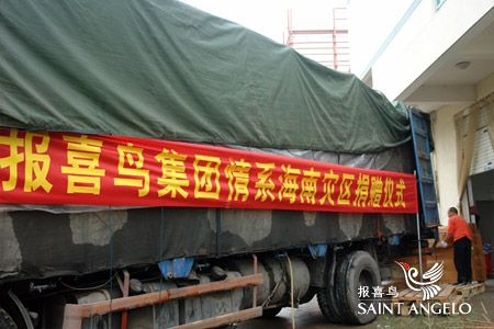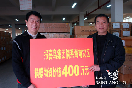 上月初,一场特大洪水突袭海南,造成了海南多个地区极其严重的内涝及洪水灾害。灾害发生后,报喜鸟集团领导高度关注灾情并积极筹集救援物资,从上海和温州两地工厂紧急调集救灾物资,包括衬衣、羊毛衫、夹克等18455件衣物,据我市物资评估部门评估,这批物资总价值达400万元。报喜鸟集团希望能给海南受灾群众送去一丝温暖,帮助他们早日走出阴霾,重建家园。集团党委书记在捐赠现场接受温州电视台采访时表示,公司多年来一直热衷于公益慈善事业,已累计捐款金额达7000多万元。每有重大灾情,报喜鸟都会力所能及奉献爱心。此次捐赠海南洪灾地区,再次体现了报喜鸟强烈的社会责任感,同时也是企业贯彻落实党中央开展“创先争优”活动的具体行动。